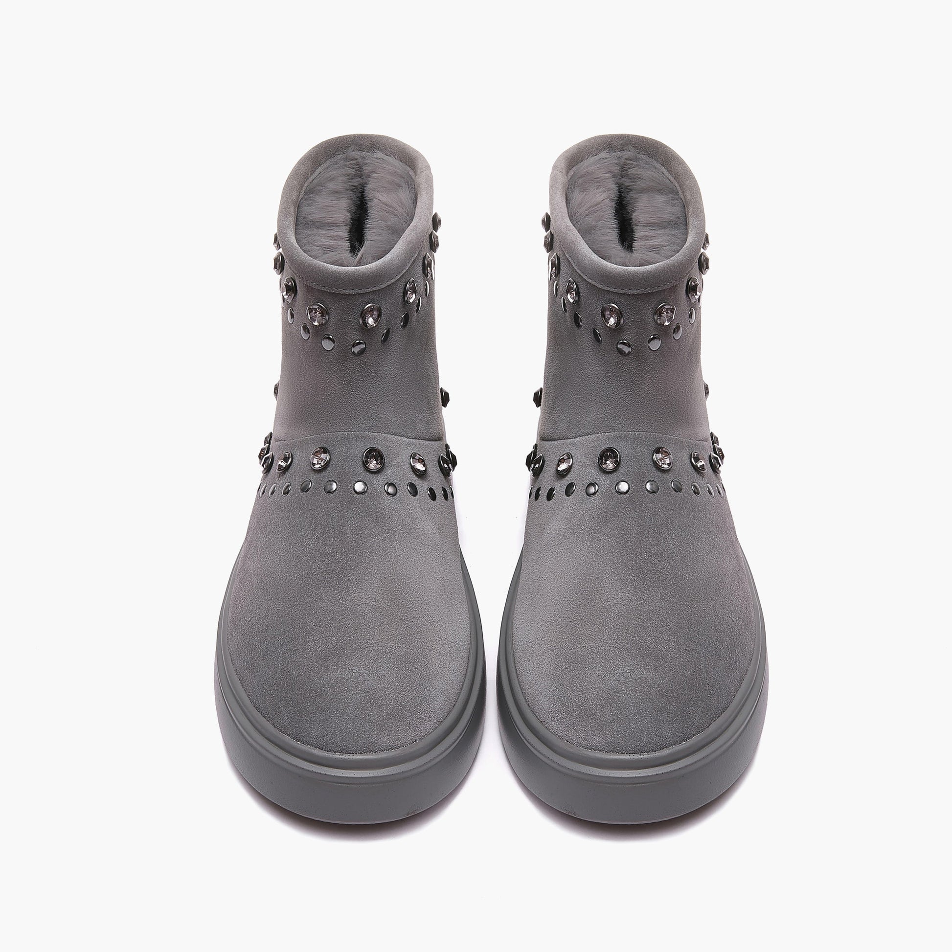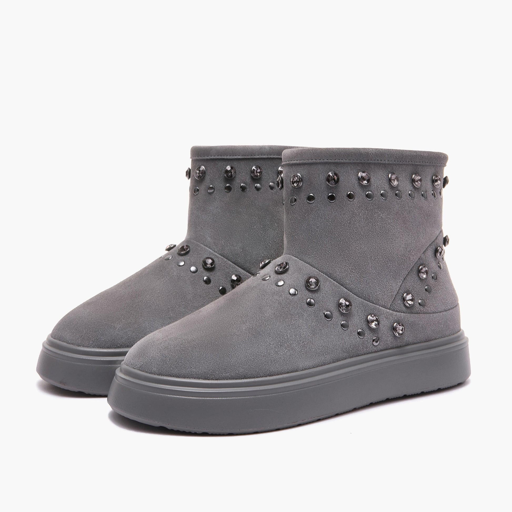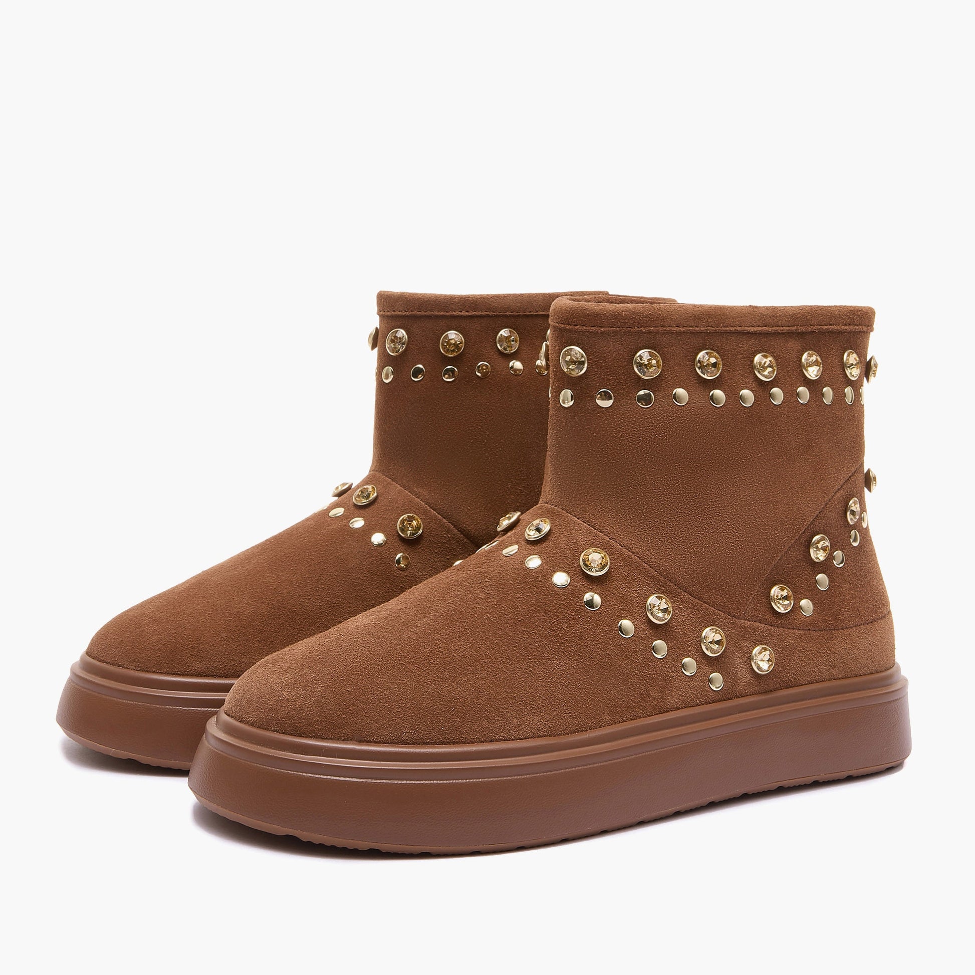 Tronchetto in pelle scamosciata foderato in pelliccia sintetica, dettagli in strass e borchie, fondo in gomma 30mm