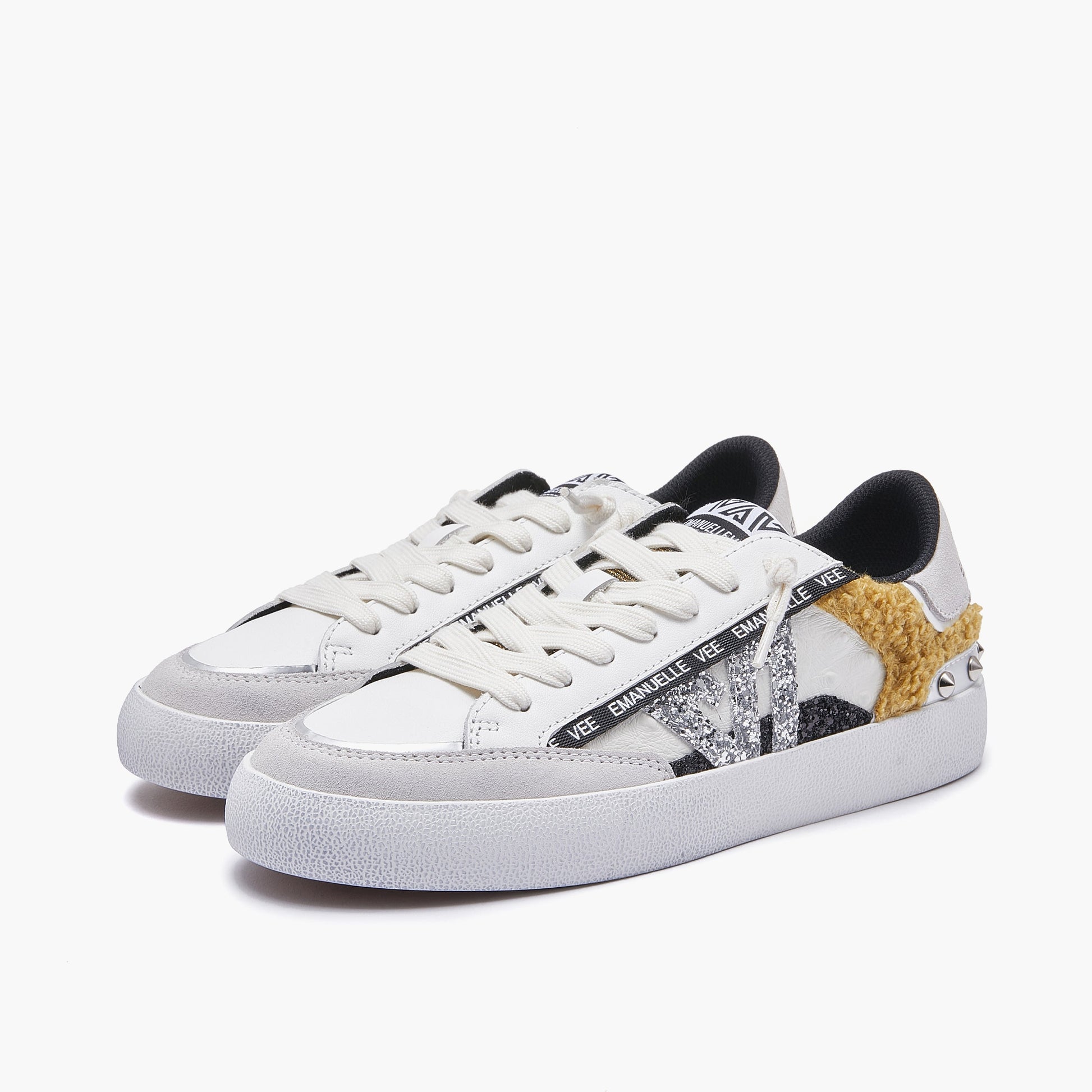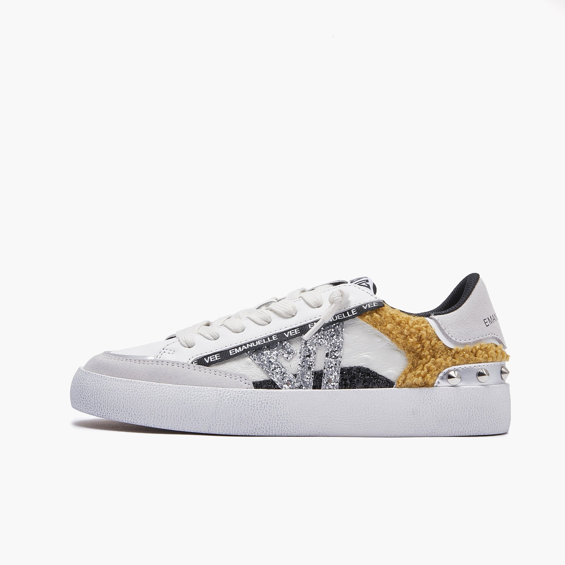 Sneaker a cassetta in pelle e mix di materiali e colori, suola in gomma