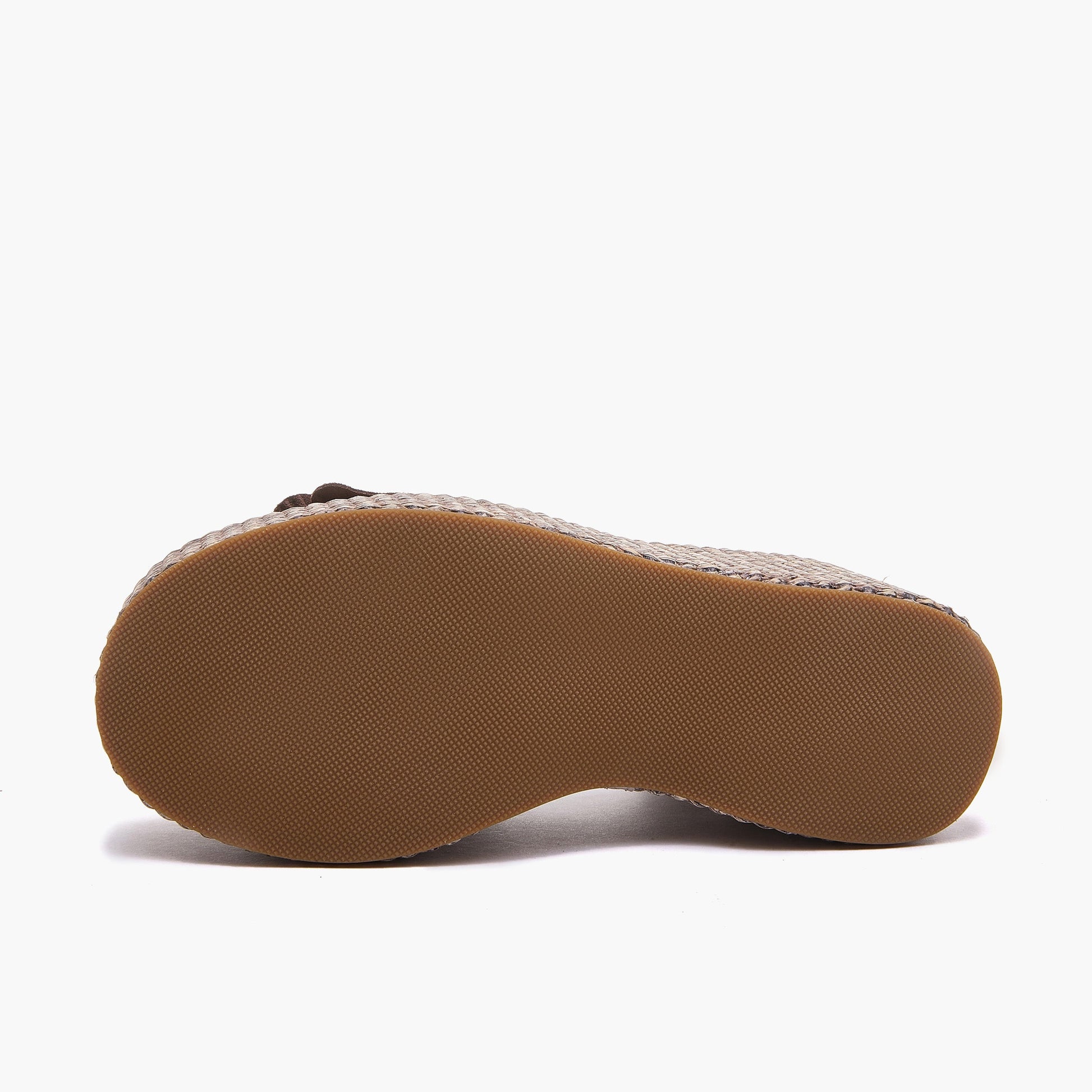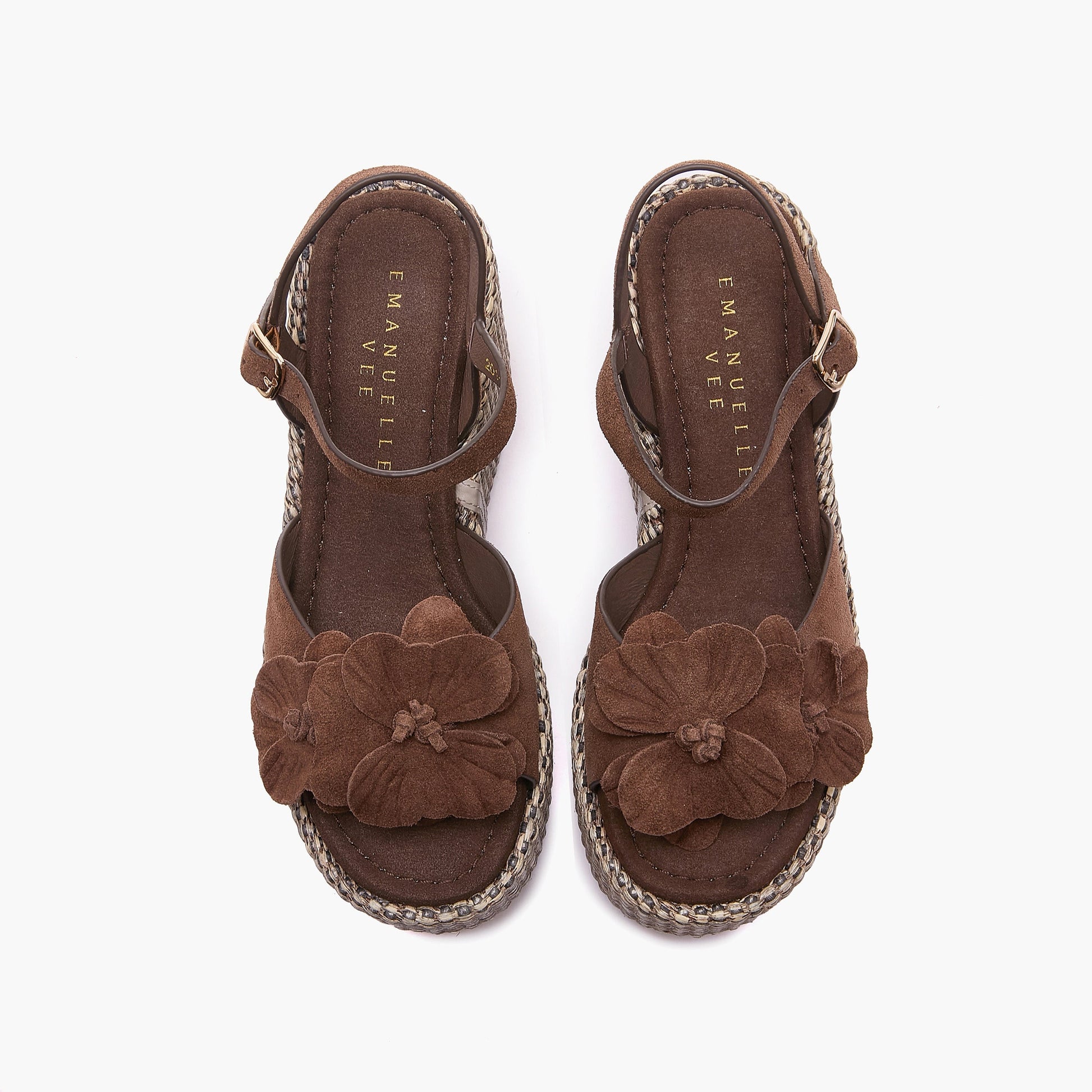 Sandalo con fiore in pelle scamosciata, zeppa in raffia 90 mm