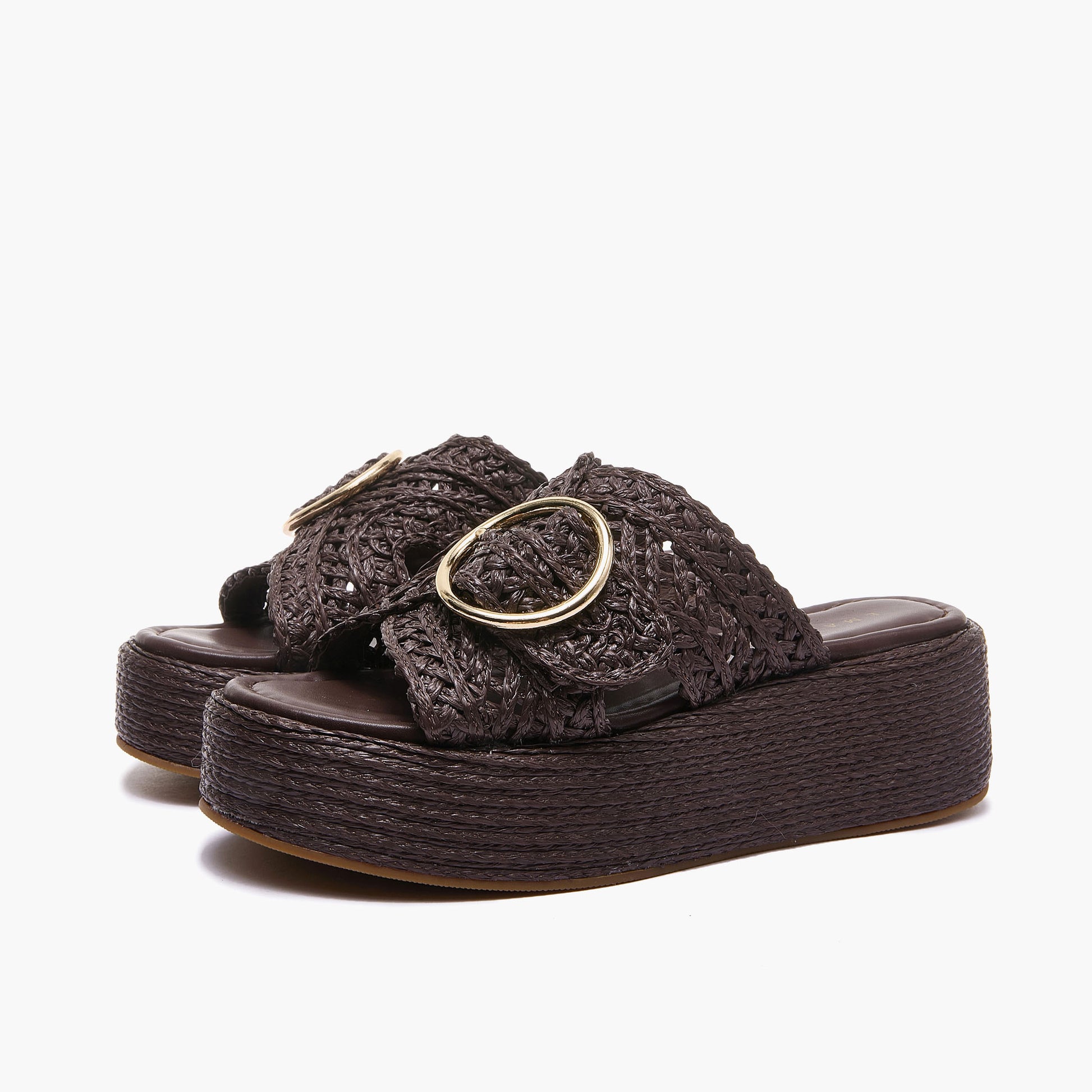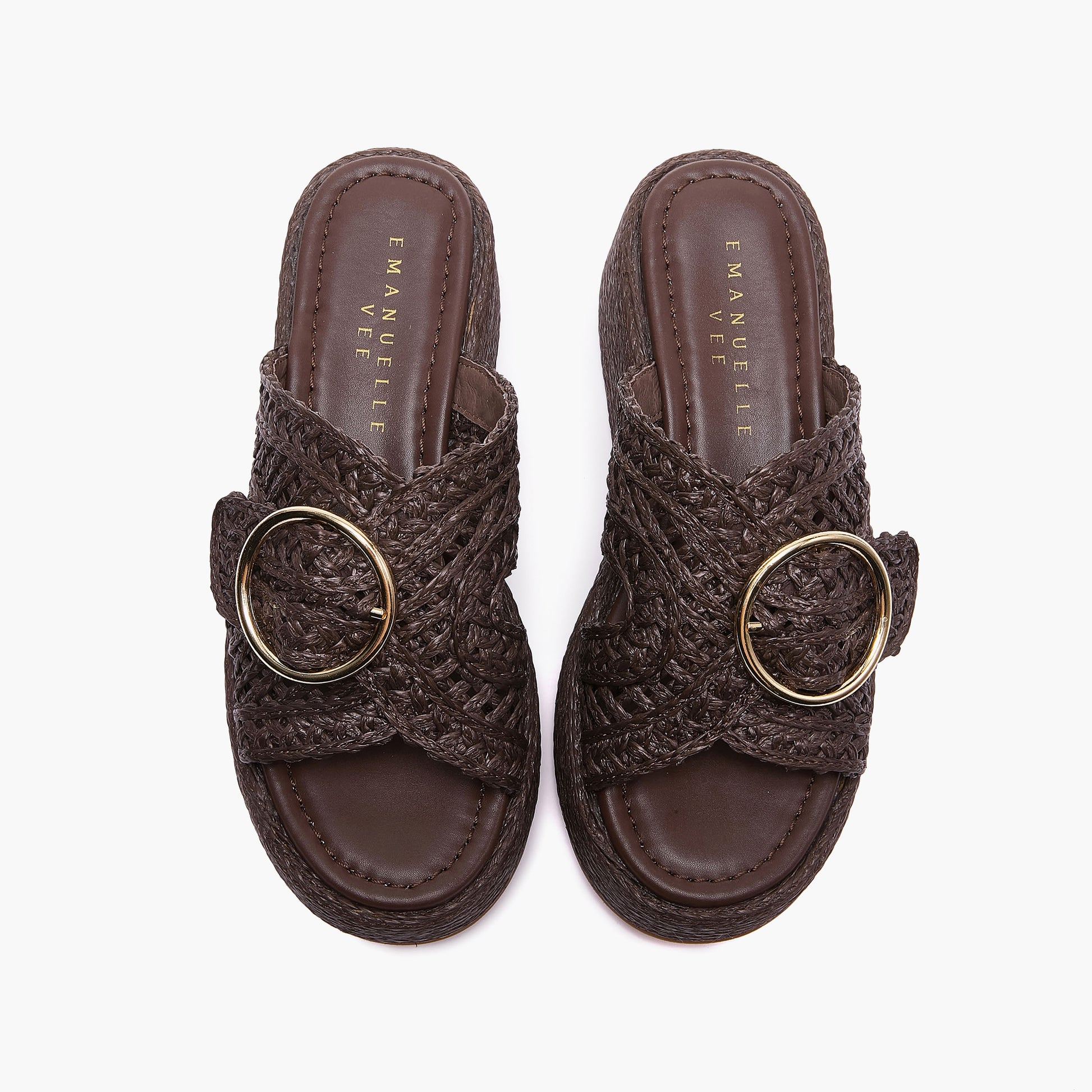 Mules in raffia sutage con fibbia, zeppa 60mm