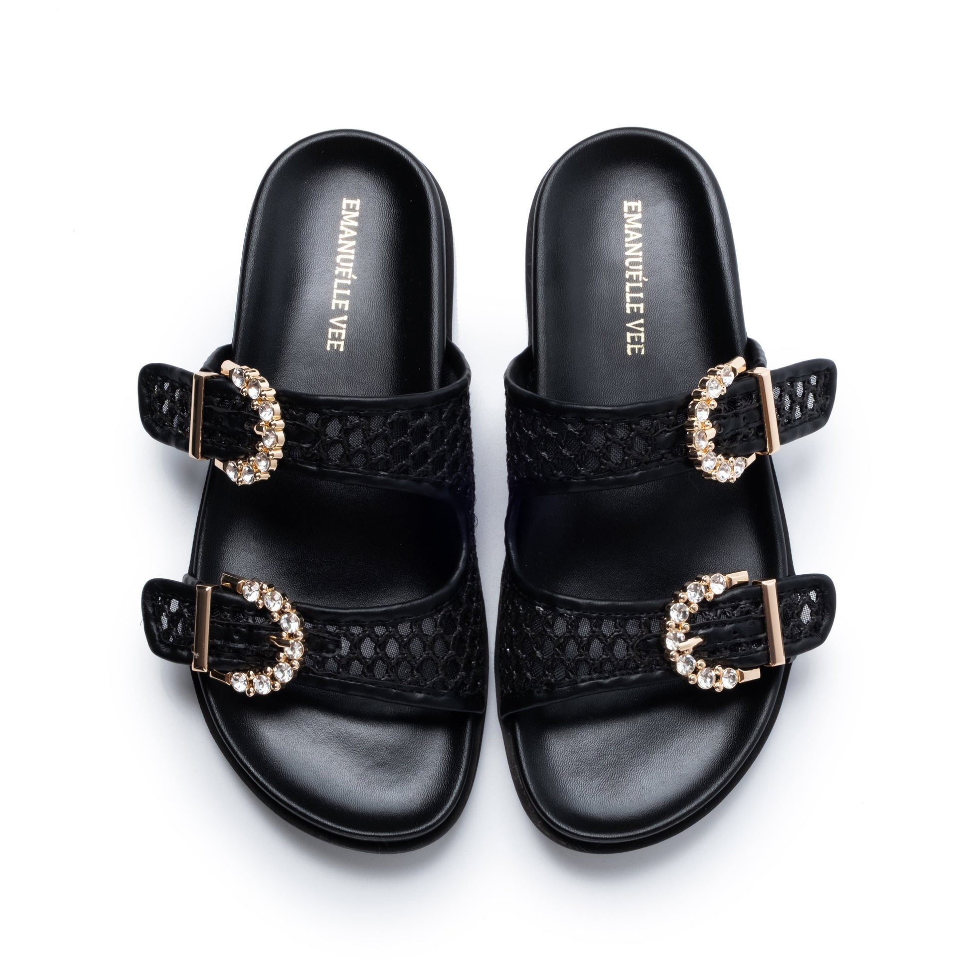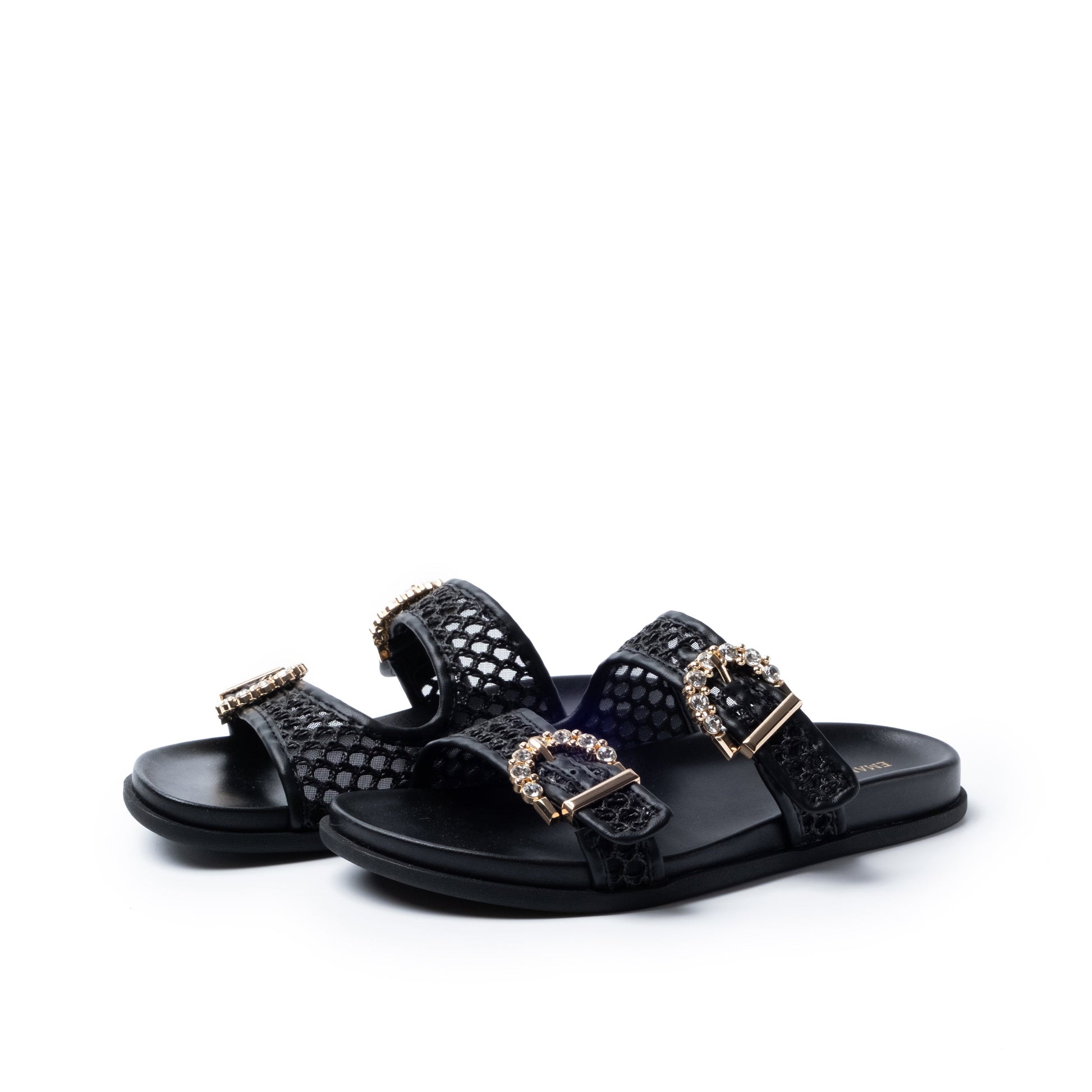 Mules in raffia, due fibbie con strass, fusbett e suola in gomma