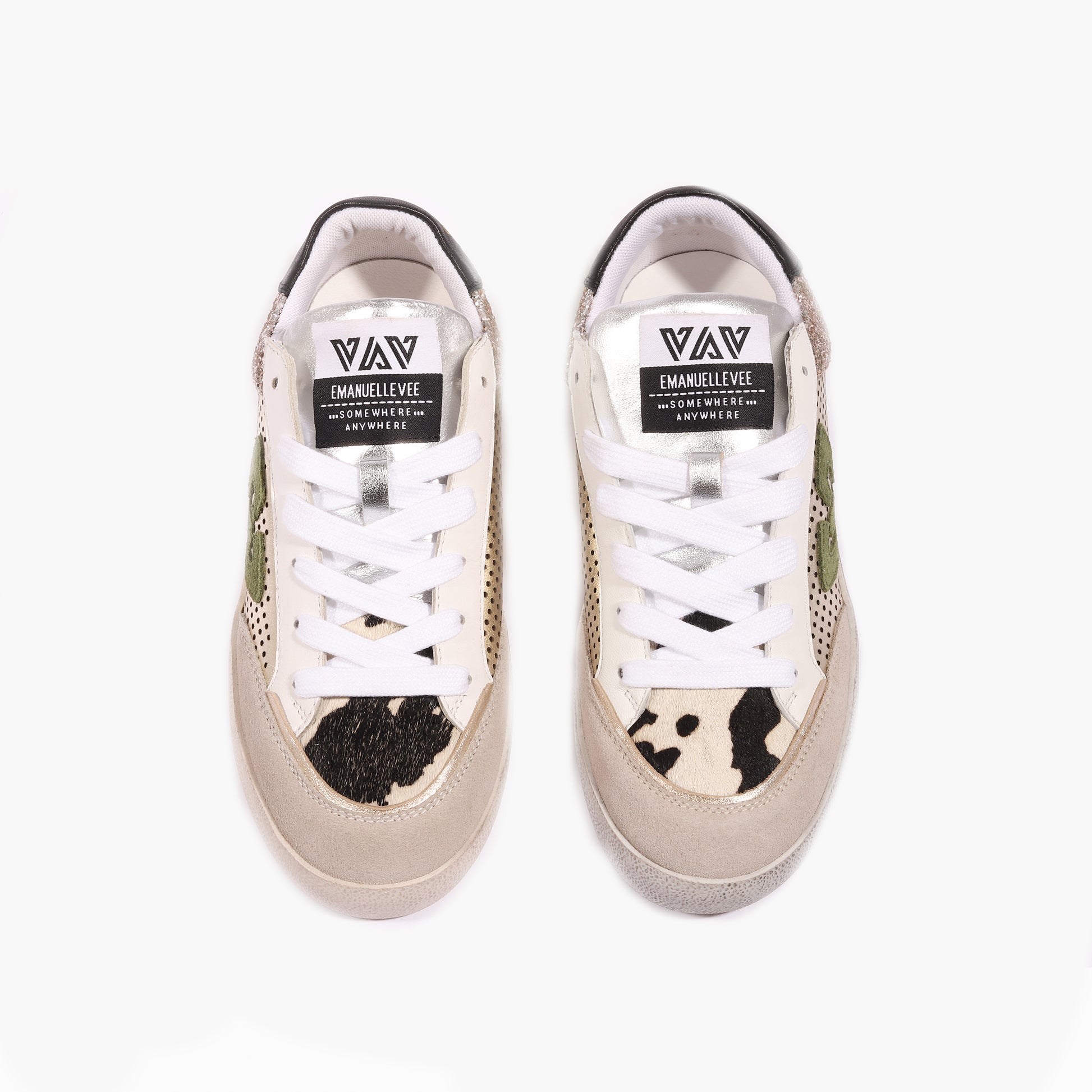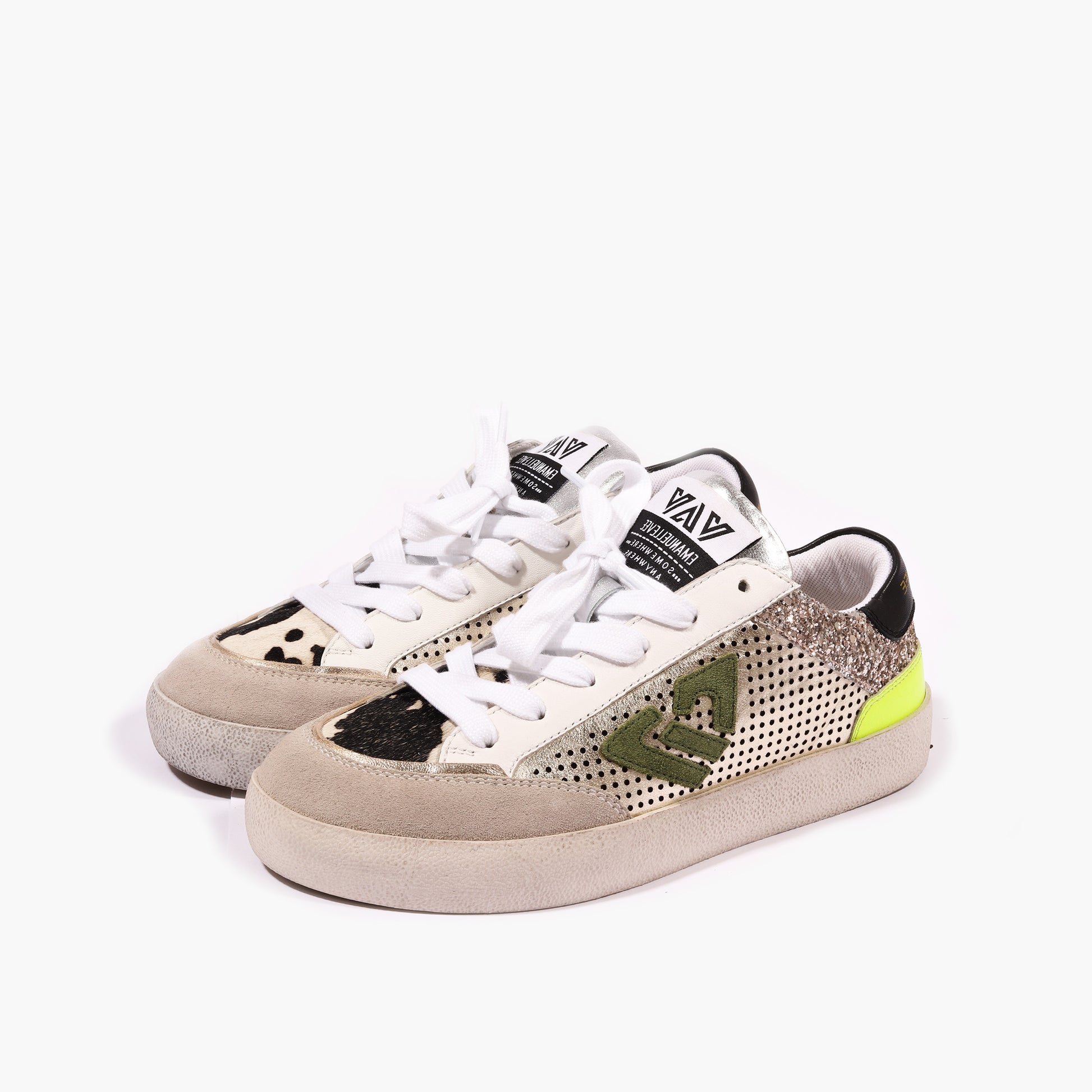 Sneakers allacciata multi materiale, pelle scamosciata e pelle laminata piu' glitter, fondo a cassetta