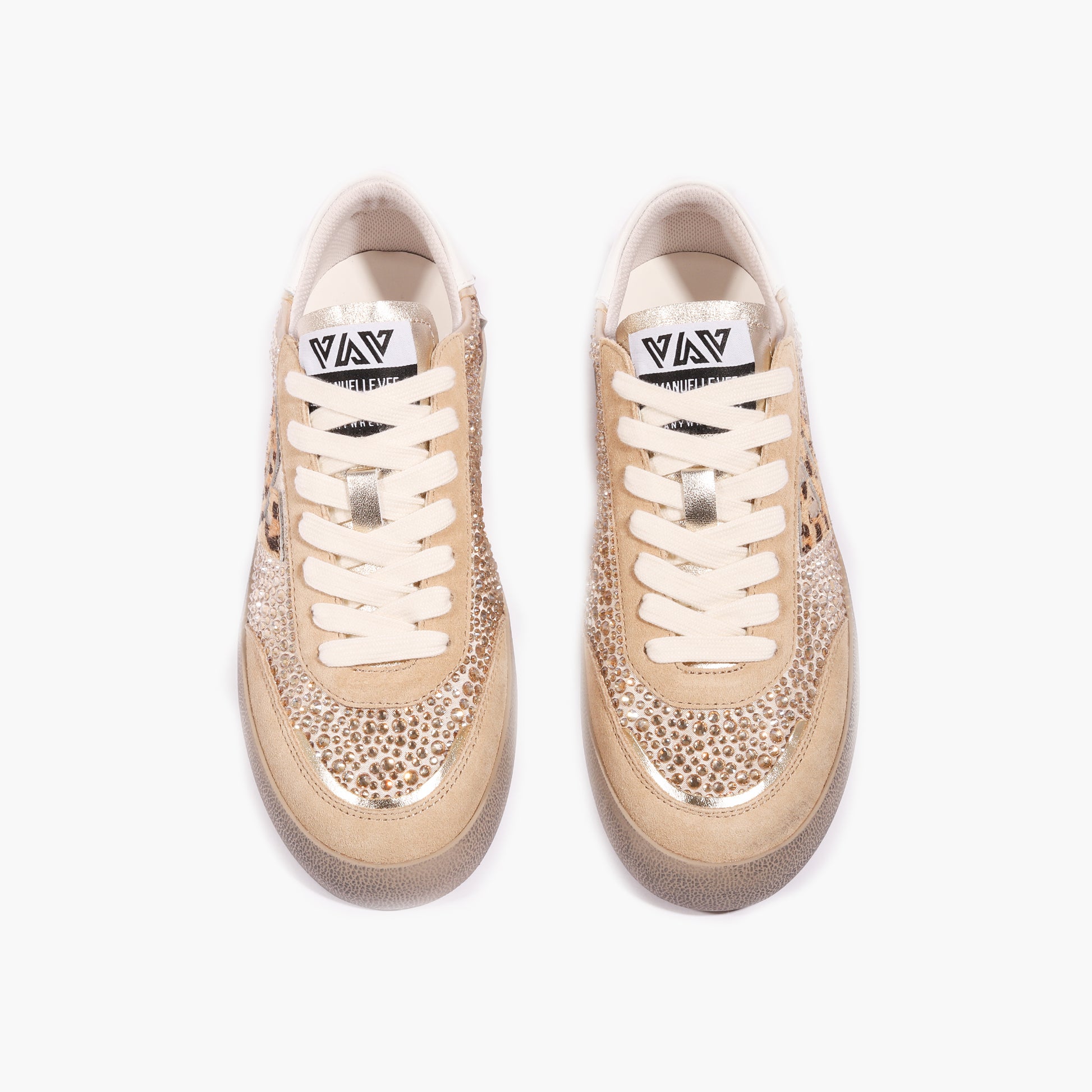 Sneakers a cassetta in pelle scamosciata e strass termo saldati, fondo in gomma