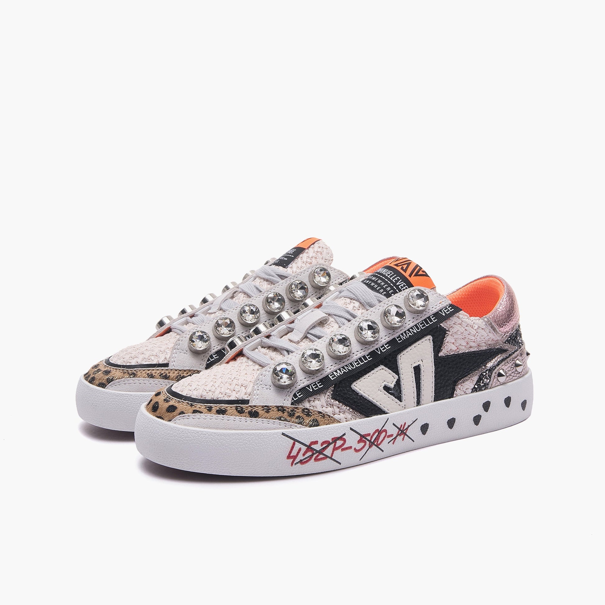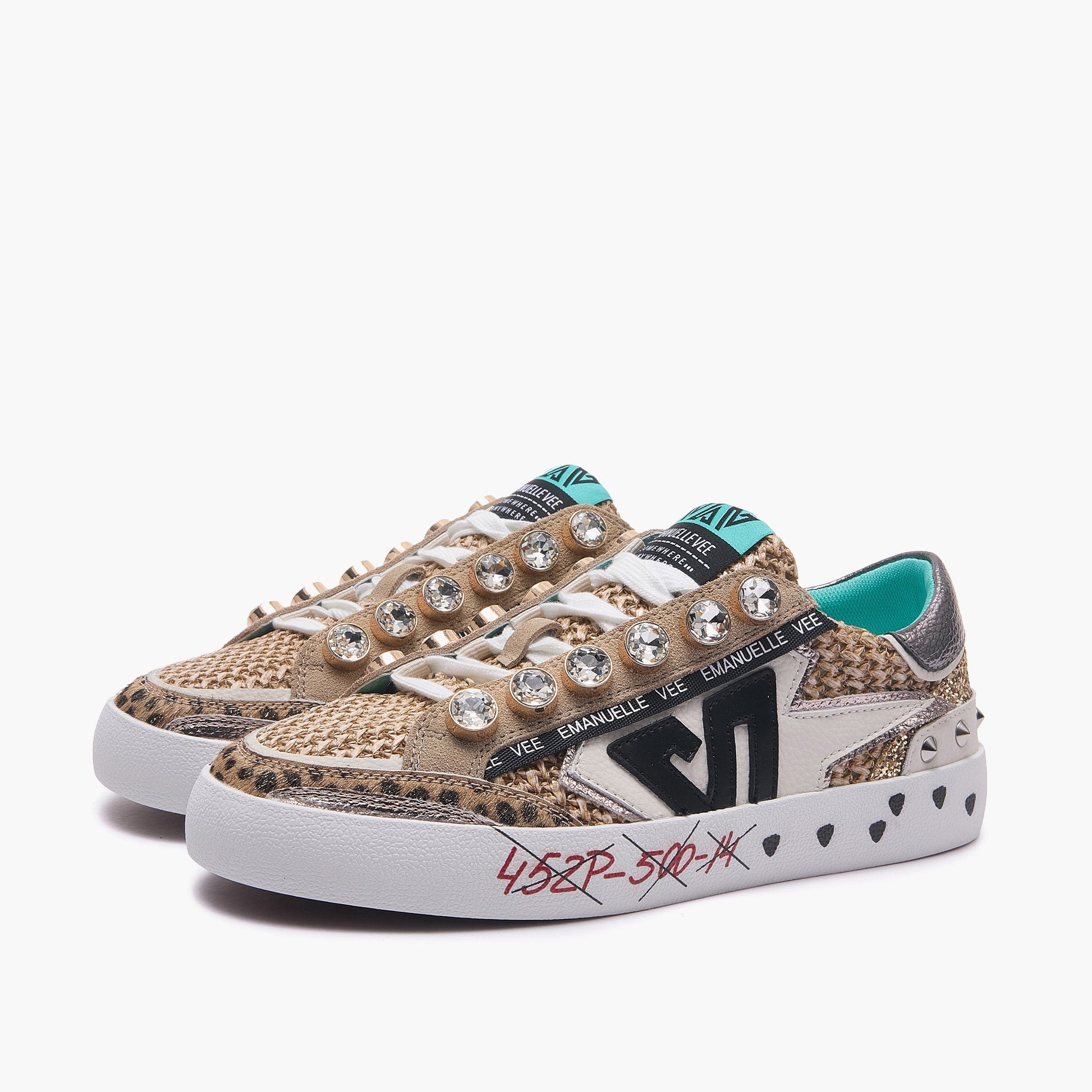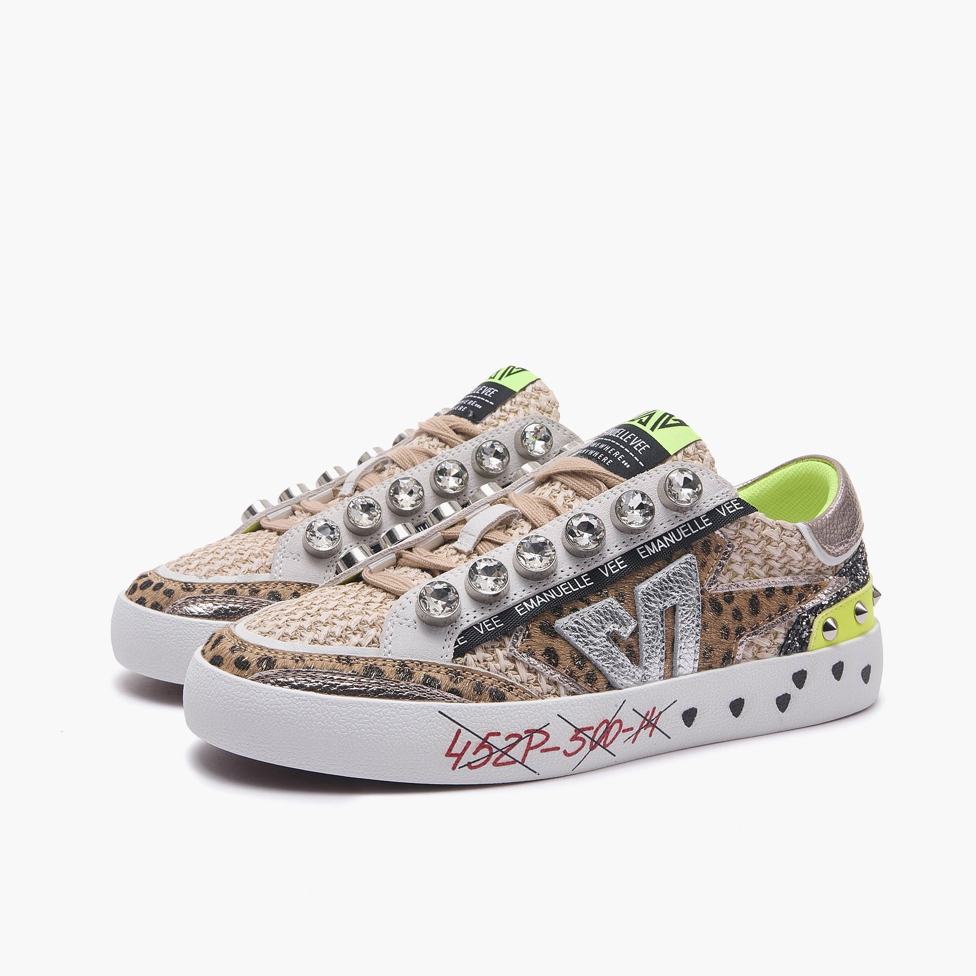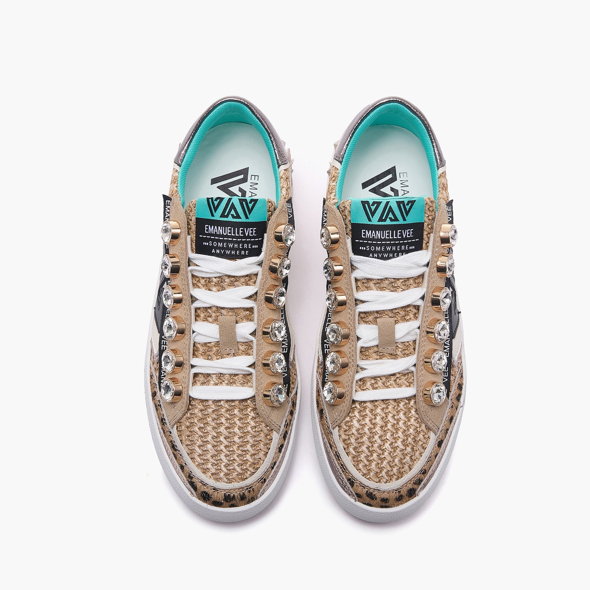 Sneakers a cassetta in multi materiale, pelle effetto leopardato, raffia e laminato bottalato, strass nell'allacciatura