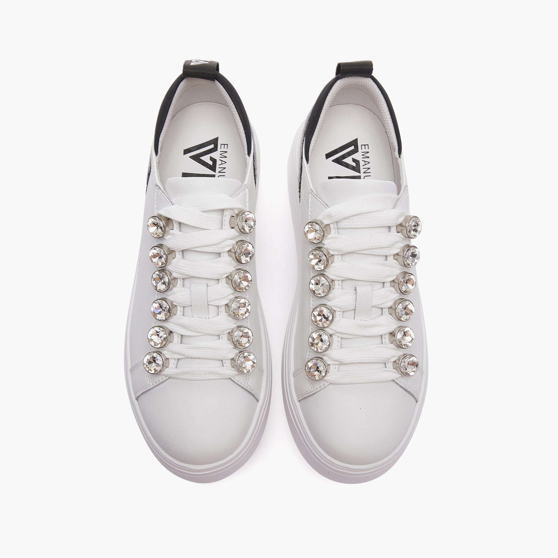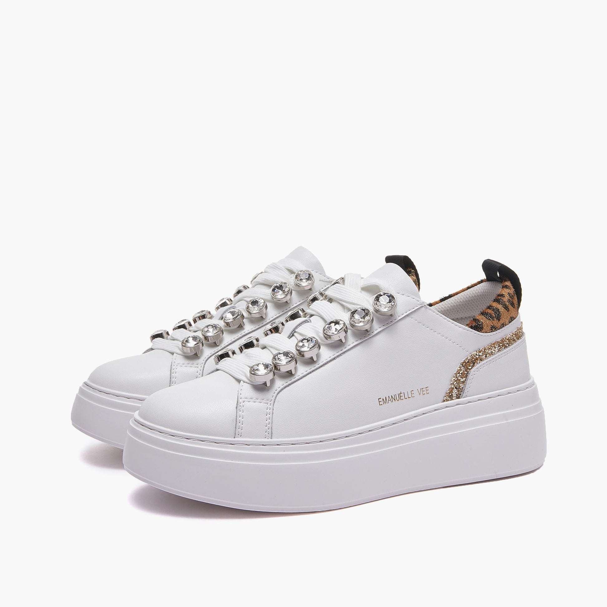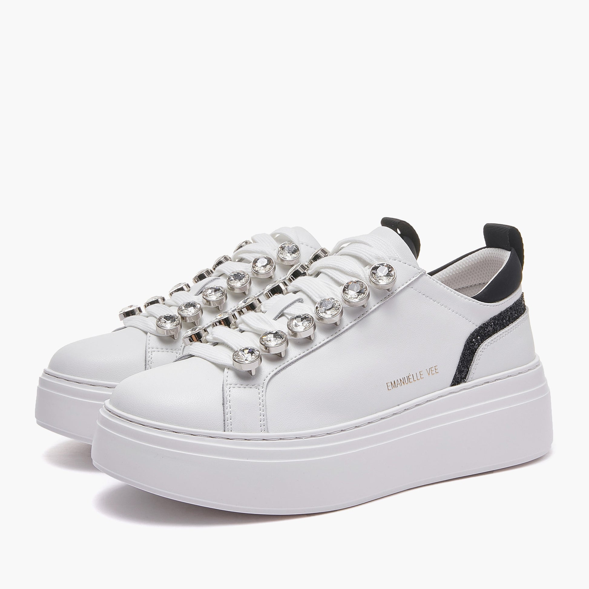 Sneaker a cassetta in pelle con dettagli in glitter e pelle a contrasto, decoro strass sull'allacciatura